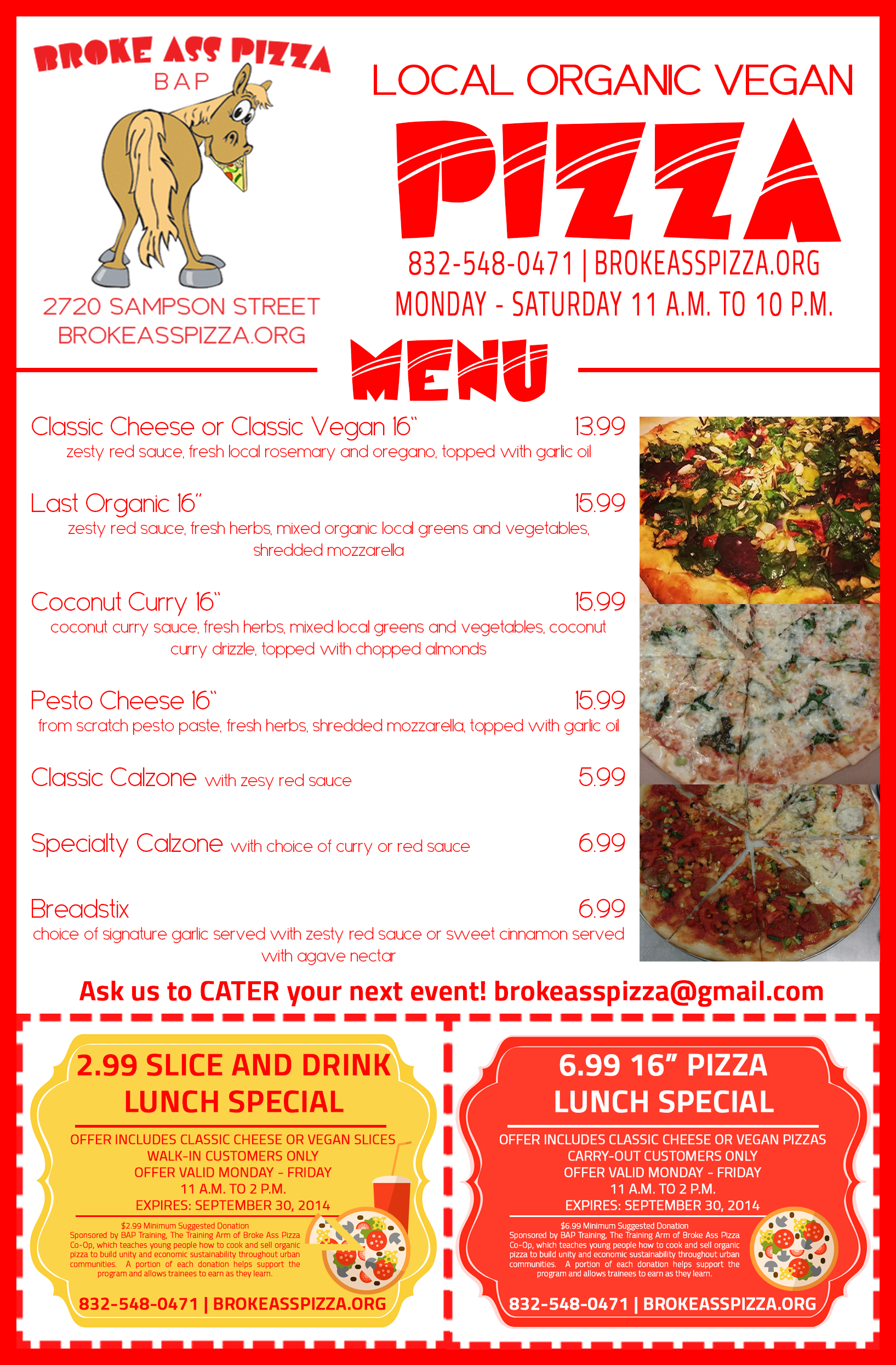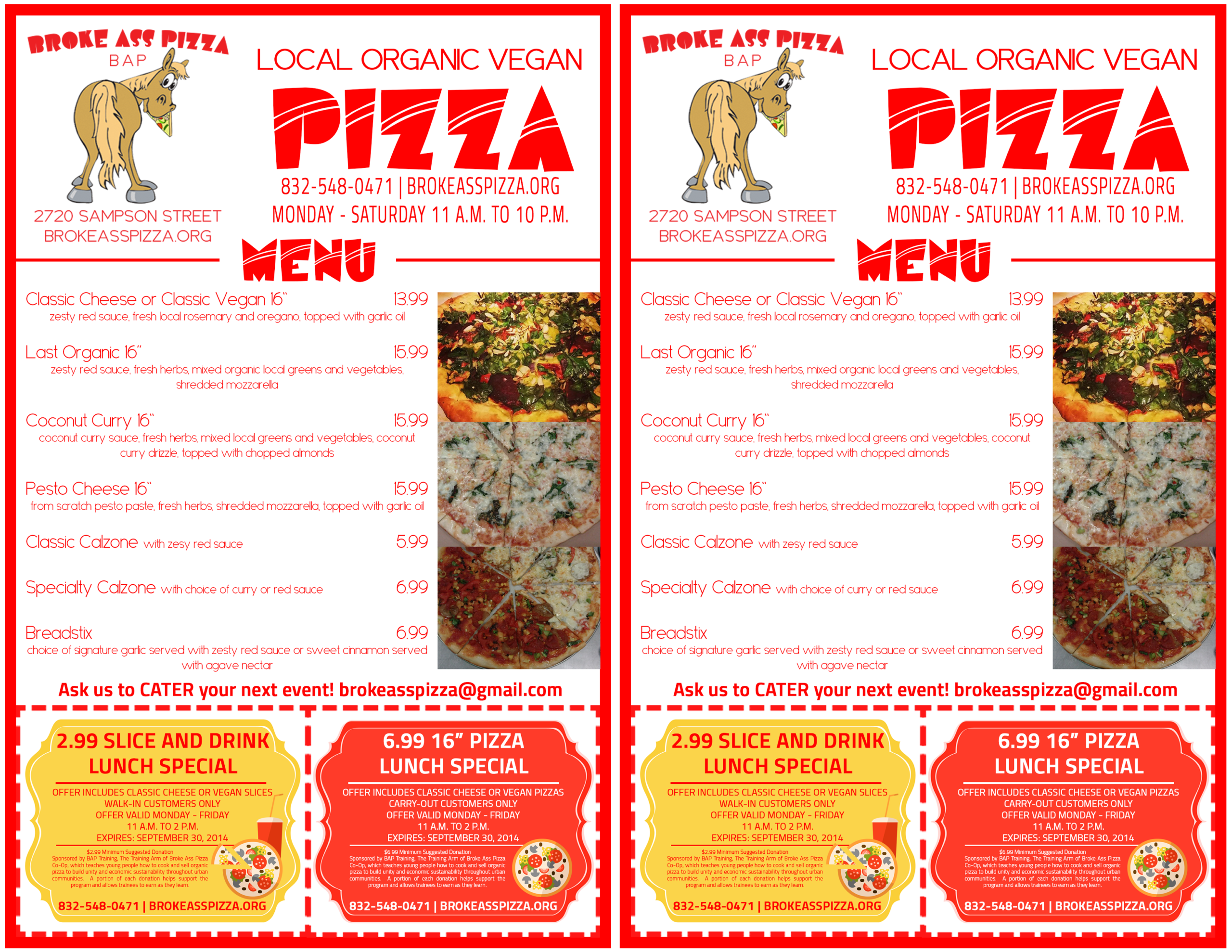 Broke Ass Pizza requested a printed menu with coupons. I created a print file where the menu could be print on one page and cut in two to minimize cost. Upon delivery of the menu I created with their original logo, they requested that I recreate their logo, as well. I presented three options to them, based on our our conversation for them to choose between.